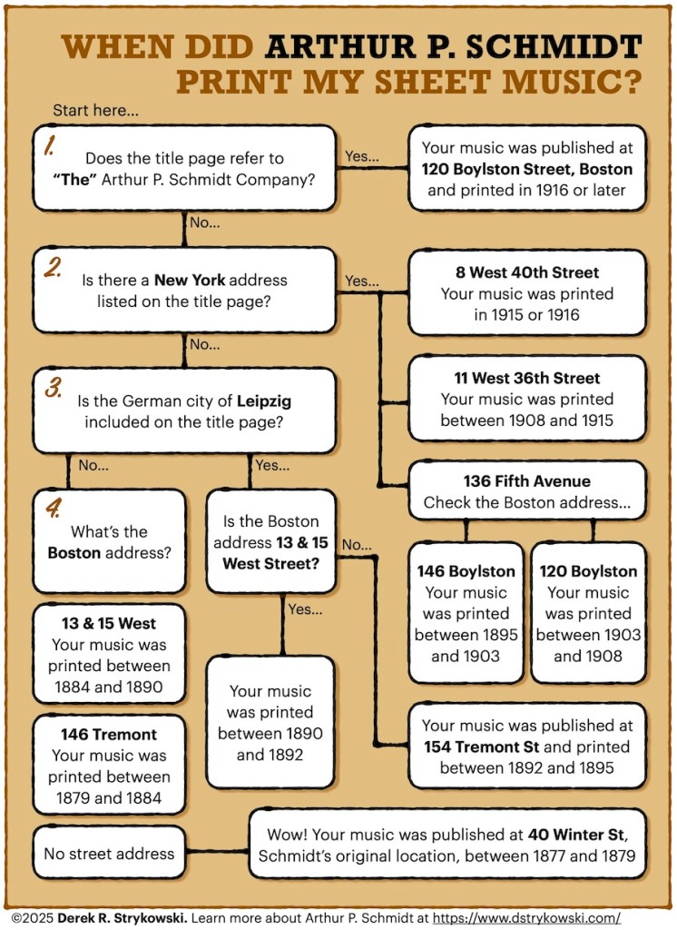 Or, “When did Arthur P. Schmidt print my sheet music?”